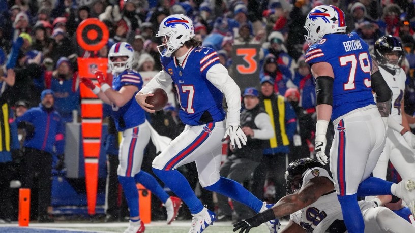 Josh Allen (28) pesa 108 kilos y mide 1.96 mts. Fue como un corcel de Ben Hur cuando llevó la pelota pegada al pecho dos ocasiones a las diagonales para ser como un solista virtuoso de la mejor orquesta, esa que en el Highmark Stadium, con sus 71 mil espectadores rugía, vestido de azul, para completar el 10-0 en casa y doblar al inmenso Lamar Jackson y sus Cuervos 27-25, en una piscina de hielo, esa donde Mark Andrews (29) resbaló en la acción clave, cuando perdió el ovoide, la vertical y el juego. Al final Mark huyó de cámaras y micrófonos, pese a que la NFL exige a los jugadores disponibilidad para los medios. Los Bills tuvieron una nueva vida eléctrica.