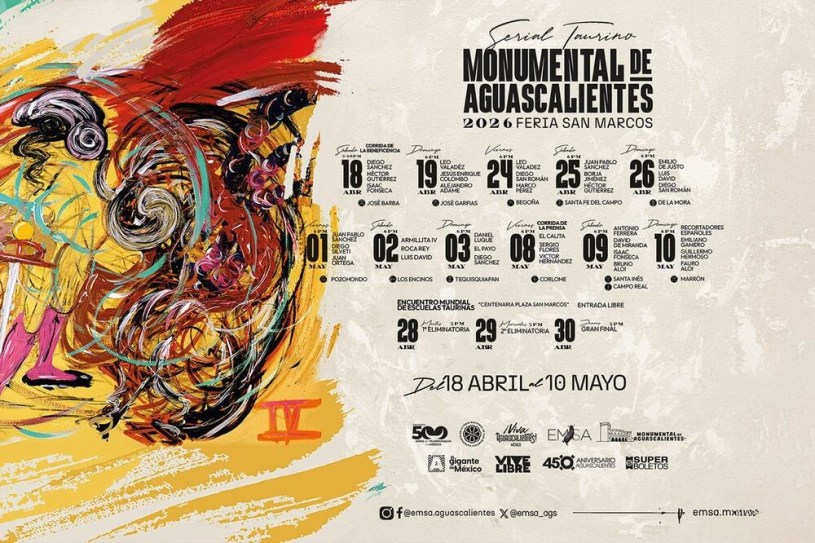 La Feria Nacional de San Marcos, en su edición 2026, presenta un elenco fantástico en todos los ámbitos: el taurino, el cultural, el deportivo y el del entretenimiento. Del sábado 18 de abril al domingo 10 de mayo, México se viste de Aguascalientes y Aguascalientes se viste de México.